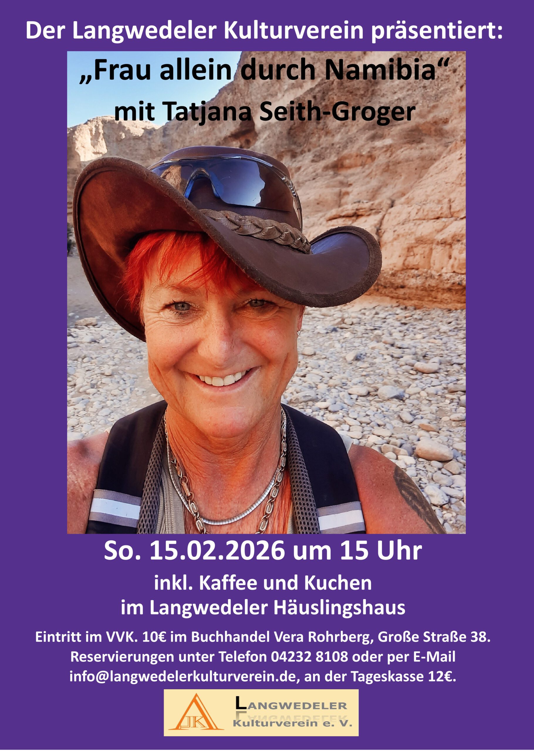 Am Sonntag, den 15. Februar 2026 um 15:00 Uhr, lädt der Langwedeler Kulturverein  zu einer besonderen Veranstaltung ins Häuslingshaus ein: Frau Seith-Groger präsentiert ihren eindrucksvollen Reisebericht „Frau, allein durch Namibia“.