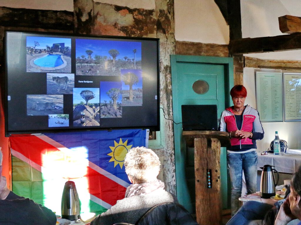 Eineinhalb Stunden lang erzählte sie lebendig und authentisch von ihrer Fahrt durch die endlosen Landschaften der Namib-Wüste. Mit eindrucksvollen Panoramabildern zeigte sie die unermessliche Weite und Einsamkeit dieser besonderen Region. Besonders faszinierend waren ihre Aufnahmen der höchsten Dünen der Welt, die sie im Gebiet von Sossusvlei erklomm – atemberaubende Sandberge, die im Licht der aufgehenden und untergehenden Sonne in leuchtenden Farben erstrahlten.
