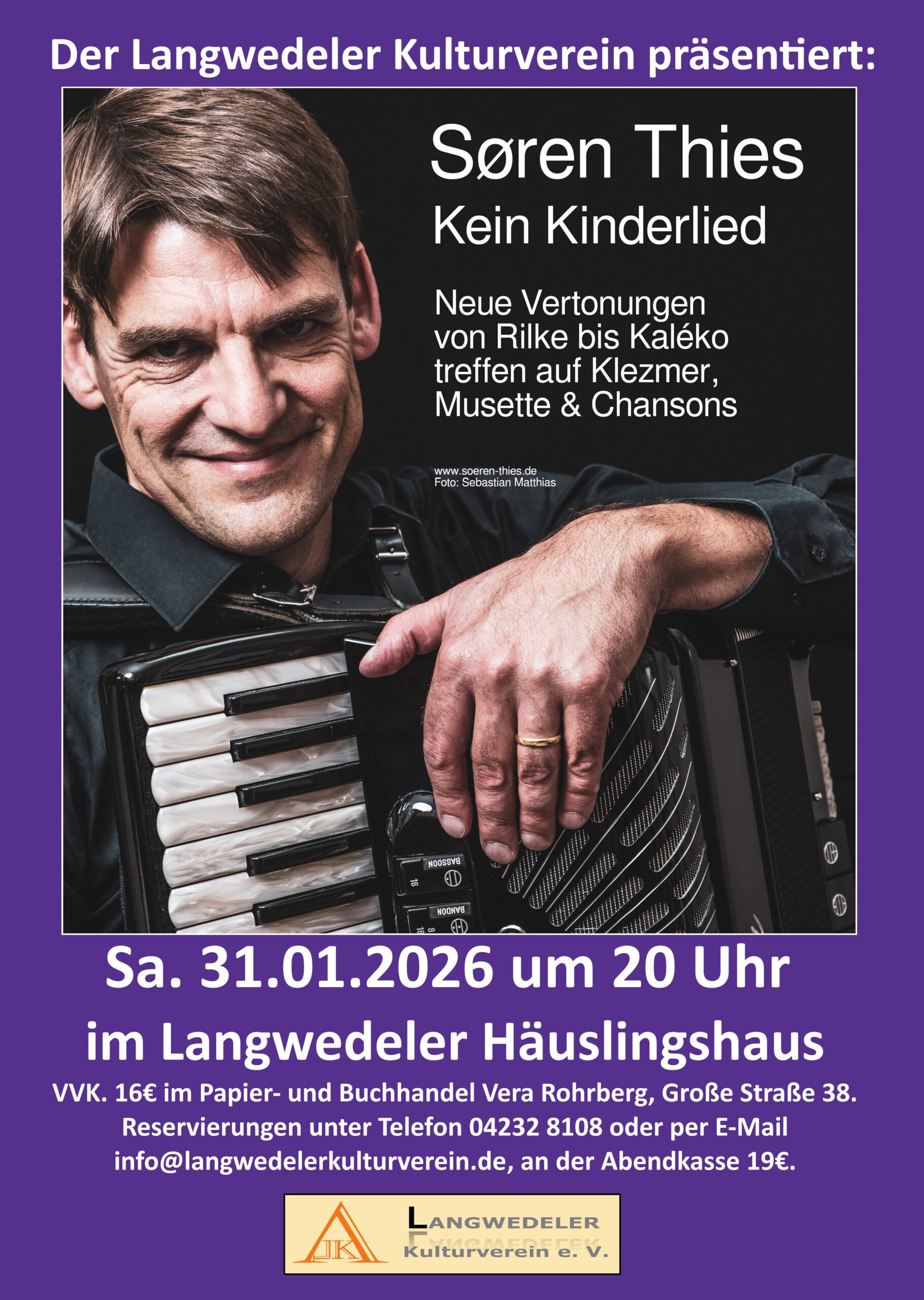 „Kein Kinderlied“ verspricht einen Abend, der Poesie und Musik in den Mittelpunkt stellt. Im Fokus stehen Gedichte des 19. und 20. Jahrhunderts, die Søren Thies neu vertont hat. Der Langwedeler Kulturverein lädt dazu herzlich am 31.01.2026 um 20 Uhr ins Häuslingshaus, Auf dem Sandberg 11 in Langwedel ein.