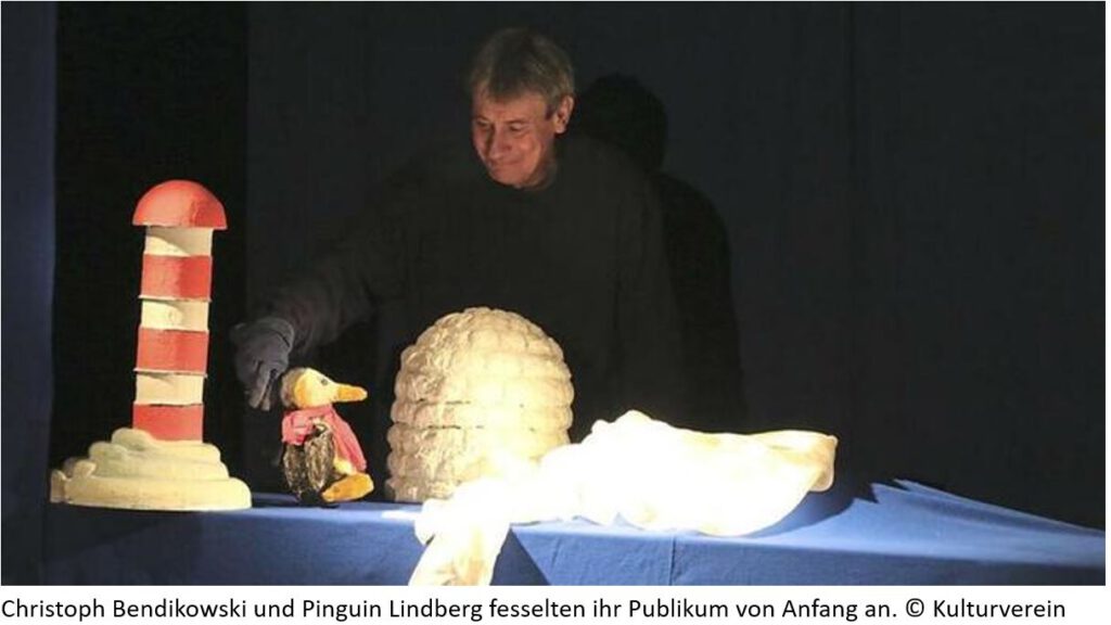 Gleich zu Beginn entpuppten sich die jungen Besucher als wahre Pinguinexperten mit ihrem Wissen über das Leben der antarktischen Vögel. Und die Geschichte vom Pinguin Lindberg, der davon träumt, wie ein Vogel zu fliegen, fesselte alle von Beginn an. Der kleine Lindberg hat es in der Pinguinkolonie nicht leicht. Während sich die anderen Pinguine zum Fischen in die Fluten stürzen, hat er wenig Spaß am Tauchen, fürchtet sich vor dem Seeleoparden und friert ständig. Dafür tüftelt er an immer neuen Flugmaschinen, um endlich fliegen zu können. Eines Tages wird in einer Kiste der Vogel Fridolin angetrieben, der unbedingt wieder nach Hause zu Blumen und Bäumen möchte. Wie es schließlich dank Lindbergs pfiffiger Erfindungen gelingt, ihm diesen Wunsch zu erfüllen, erzählt Christoph Bendikowski mit seinen zauberhaften Puppen und einem phantasievollen Bühnenbild. Mit kräftigem Applaus wurden der Künstler und der pfiffige Pinguin verabschiedet.