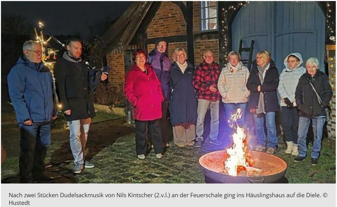 Langwedel – Zur Adventsfeier hatte der Langwedeler Kulturverein in das Häuslingshaus eingeladen – inklusive Spezialkonzert an der Feuerschale vor dem Haus. Die Vorsitzende Silke Fronzek stellte nach der Begrüßung Nils Kintscher vor. Als er mit seinem Dudelsack zu spielen anfing, öffneten sich auch die Türen in den benachbarten Häusern. Kintscher spielt bei „Crest of Gordon – City of Bremen Pipes & Drums“. Diese bemerkenswerte Bremer Band gibt es bereits seit mehr als 30 Jahren.