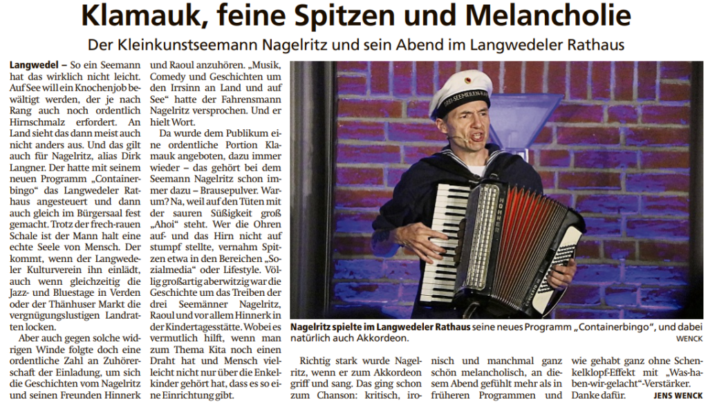 Im gut gefüllten Rathaus Langwedel begrüßte der Kulturverein nach 2020 zum zweiten Mal Dirk Langer alias ‚Nagelritz‘. Die Gäste durften sich auf Langers neues Programm ‚CONTAINER-BINGO‘ freuen. „Containerbingo ist ein beliebtes Spiel der Seeleute. Du öffnest einen beliebigen Container und bist gespannt, was du vorfindest. So wie im Leben halt. Menschen, Ereignisse und Dinge fallen dir vor die Füße und dann musst du damit klarkommen.“